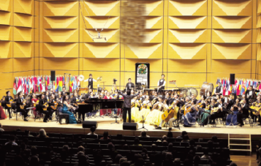 この活動は、国連NGOをはじめとした “平和に寄与した賞” の受賞にもつながり、2003年からは国連NGO「WPPS(World Peace Prayer Society)」、「五井平和財団」のご協力のもと、メインテーマを「平和を願って」とし、万国旗をステージ上に飾りながら平和を祈る楽曲を演奏するようになりました。